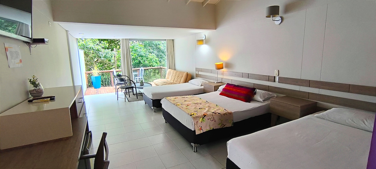 Somos un resort campestre en San Jerónimo a solo 45 minutos de Medellín. Un lugar de riqueza natural y clima tropical donde podrás encontrar una variedad de espacios. Quimbaya la casa del sol, tiene para ti espacios confortables donde podrás disfrutar de buena alimentación, bebidas, espacios verdes, zonas húmedas y habitaciones con 2 camas dobles aptas para tu descanso.