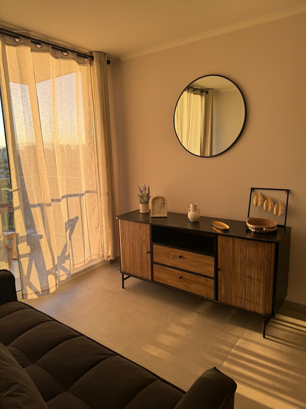Disfruta de un tipo estudio perfecto para descansar. Muy acogedor y con todas las comodidades necesarias para que no te falte nada durante tu estadía. Al estar de viaje una de las cosas más importantes es tener una buena ubicación, acá tendrás la oportunidad de tener justo enfrente una de la líneas de metro con mejor conectividad, estación Ñuble donde combinan línea 5 y 6. Además de variedad de comercios y restaurantes a pocos pasos del edificio. Queremos que en tu viaje sea lo más cómodo.