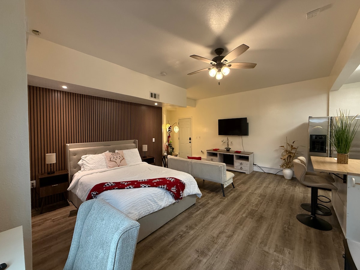 The apartment is full-service, attached to the main house with a private entrance and private patio. It is located 9 miles east of Old Town Clovis. Our unit includes a bedroom, dining area, living room, and a complete kitchen with all the necessities for coffee, tea, and cooking. Internet is available through both Wi-Fi and an Ethernet connection with cabling provided. The TV is 4K Active; HDR Smart TV, 43", true color accuracy with Ethernet connection to our internet.