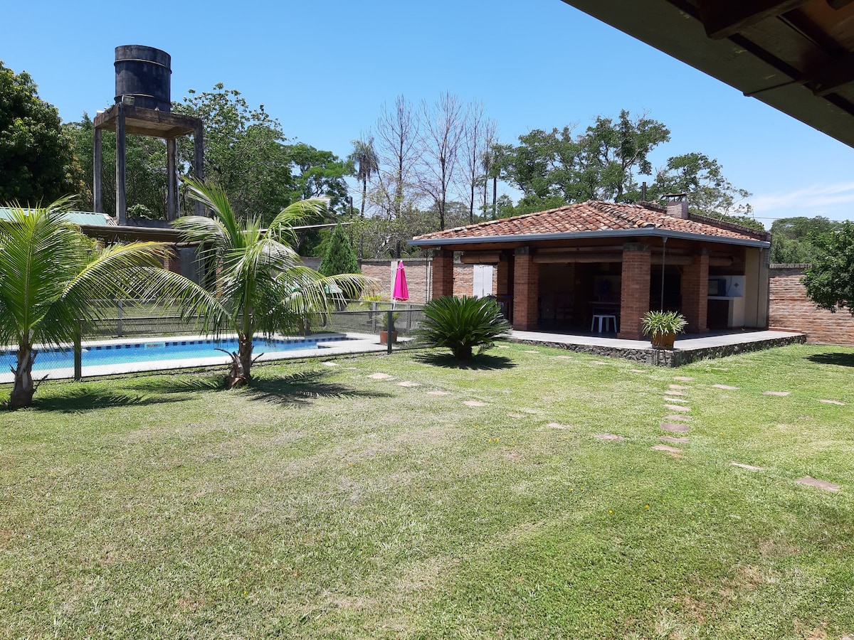 Fully Private Cozy Familiar Cottage design to escape from the city and relax in nature connected eviroment, Adressed to those who like quiet places with many outdoors activities. 15 minutes away from Luque City Center and 25 from International Airport. Easy access and supply shops in sorroundings You''ll have -Fully Equiped Kitchen -5vs5 Natural Grass Soccer Field -25mts Long Basketball Field -12mts long Swimming Pool -Little Amusement Park for Kids -High Speed Internet for remote work