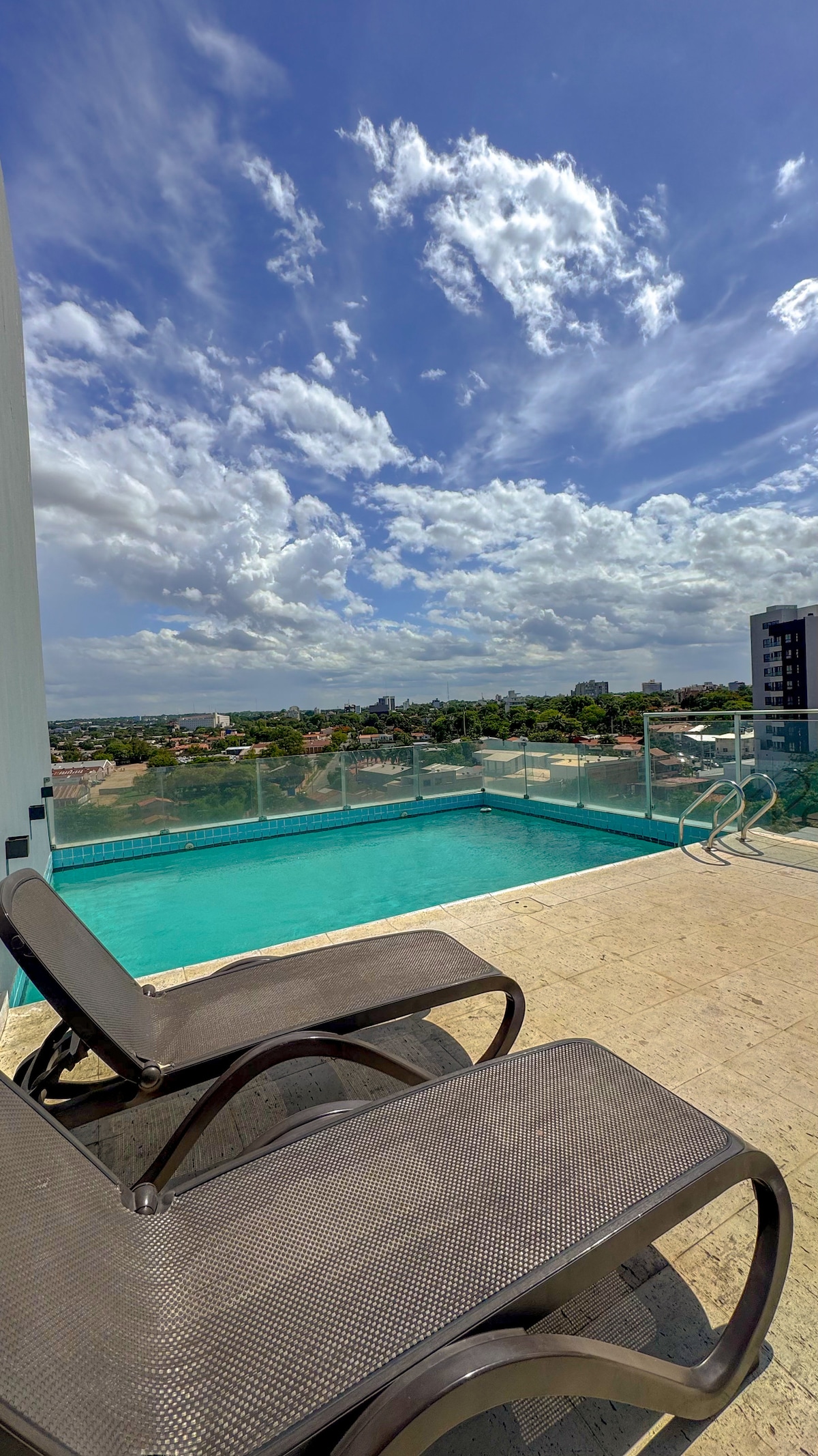 Departamento súper equipado en zona residencial, con balcón y parrilla, hermosa vista y amenities premium: - Piscina con solarium - Piscina climatizada - Sauna - Gym en altura - Rooftop + Quincho - Laundry - Seguridad 24hs - Cochera Excelente ubicación: - A 7 minutos del Eje Corporativo, Shopping del Sol y Paseo La Galería - A 10 minutos de la Costanera y el Puente Héroes del Chaco - A 15 minutos del Aeropuerto Silvio Pettirossi Cuenta con Wi-Fi, Smart TVs y colchones firmes de alta densidad