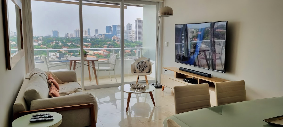 Departamento súper equipado en zona residencial, con balcón y parrilla, hermosa vista y amenities premium: - Piscina con solarium - Piscina climatizada - Sauna - Gym en altura - Rooftop + Quincho - Laundry - Seguridad 24hs - Cochera Excelente ubicación: - A 7 minutos del Eje Corporativo, Shopping del Sol y Paseo La Galería - A 10 minutos de la Costanera y el Puente Héroes del Chaco - A 15 minutos del Aeropuerto Silvio Pettirossi Cuenta con Wi-Fi, Smart TVs y colchones firmes de alta densidad