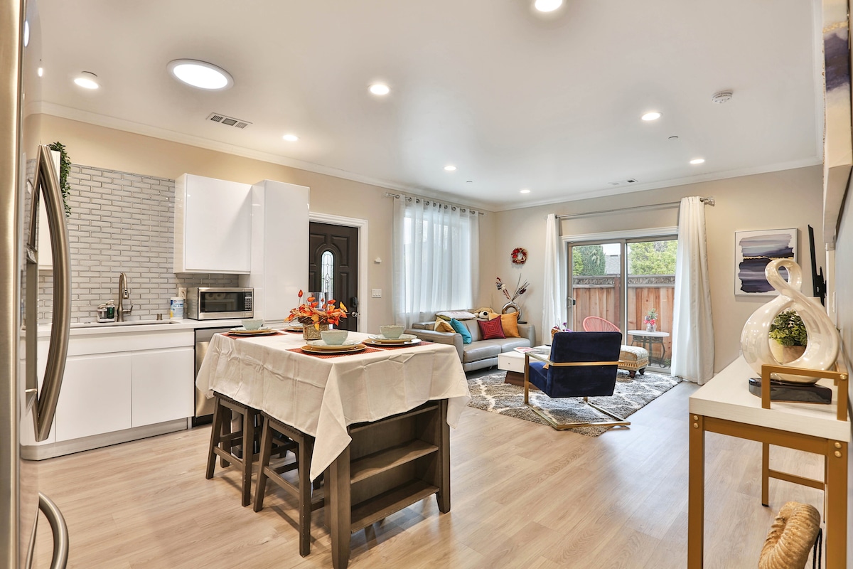 Fully renovated in 2022, everything is new. This stylish 2nd-floor condo overlooks vibrant Santana Row - the jewel of the Silicon Valley/South Bay Area with great restaurants, shopping, movie, spa, salon, and many entertaining options just downstairs. There are 1 queen, 1 twin and 2 large sofas. The entire space has been renovated - kitchen, bathroom, floor, paint, lights, and all new appliances. High speed WiFi and ex-large screen smart TV.