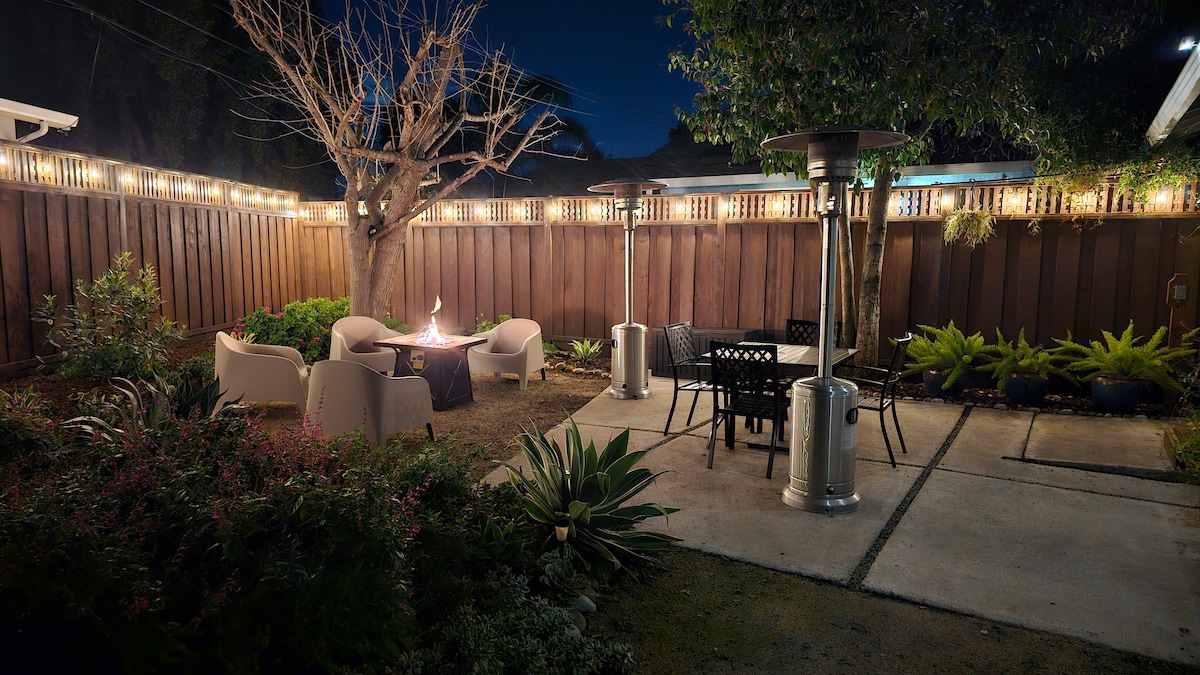 Unwind in style in Silicon Valley's heart. Our backyard offers a peaceful retreat, complete with fruit-bearing trees and ambient lighting. Modern comforts await indoors, from brand-new furnishings, high speed internet, an executive office and a large dining. Your culinary adventures are supported by a well-stocked kitchen and our complimentary treats. With ADT protection and generous parking, convenience is a given. All set in a serene neighborhood, minutes away from tech hubs and entertainment.