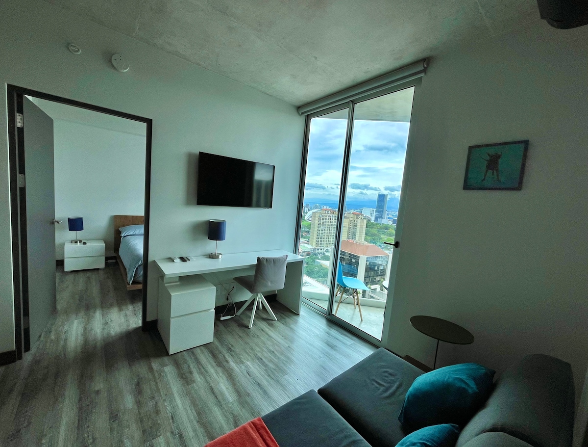 Luxury apartment with A/C, cozy, and perfectly located in the heart of the city. This fully equipped space, with modern and elegant decoration, offers you the freedom to live safely and comfortably while exploring everything the city has to offer. Close to tourist attractions, banks, supermarkets, and restaurants. (The condominium has 8 restaurants within the facilities) The International Airport (SJO) is 20 minutes away, La Sabana Park and the new National Stadium are 3 min away in San Jose.
