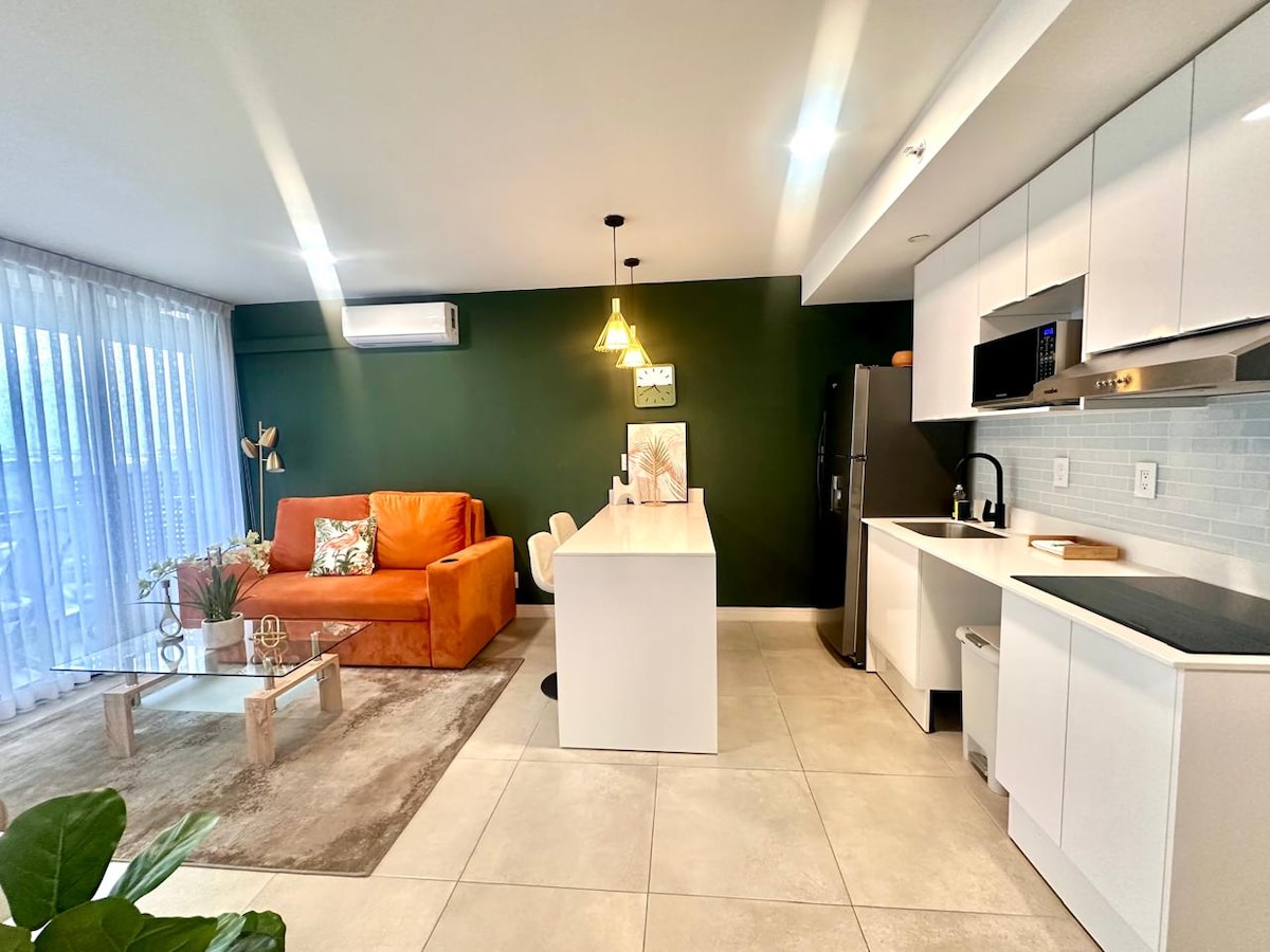 Luxury apartment with A/C, cozy, and perfectly located in the heart of the city. This fully equipped space, with modern and elegant decoration, offers you the freedom to live safely and comfortably while exploring everything the city has to offer. Close to tourist attractions, banks, supermarkets, and restaurants. (The condominium has 8 restaurants within the facilities) The International Airport (SJO) is 20 minutes away, La Sabana Park and the new National Stadium are 3 min away in San Jose.