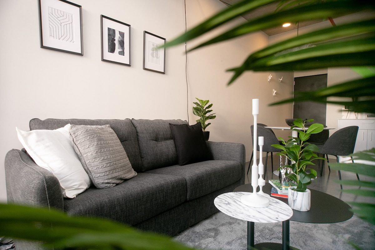 Take a morning stroll in the park before heading back to your centrally-located, industrial 2 br apartment that will welcome you with high-speed wifi, top-of-the-line kitchen appliances, amazing decor, comfortable beds, and sunset views from a 12th floor overlooking the city. Not only will you have access to unparalleled amenities like a semi-Olympic pool, saunas, gym, and co-working space, you will be a walking distance from the best restaurants, coffee shops, and grocery stores in town.