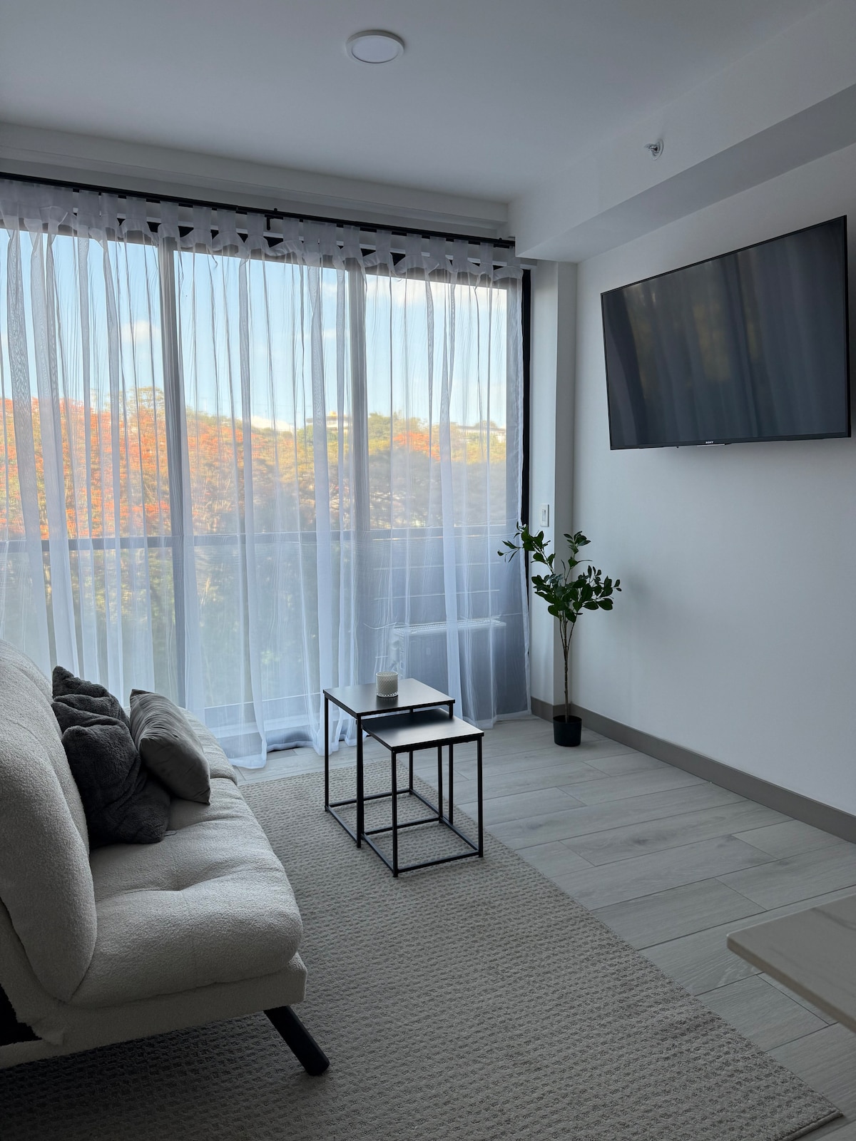 Brand new luxury apartment at Nucleo Sabana. It has a minimalist style with all the appliances brand new, including A/C, 2 smart TVs. High speed internet with TVservice. Laundry room includes a washer/dryer, 2 in 1. It has a wonderful view to the top of the trees and the sky in the balcony. There is a river next to it so you can always enjoy the river sound. Complex: More than 30 amenities, including a gastronomic market(NucleoGastro). Located 10min from Juan Santamaría Int’l Airport (SJO).