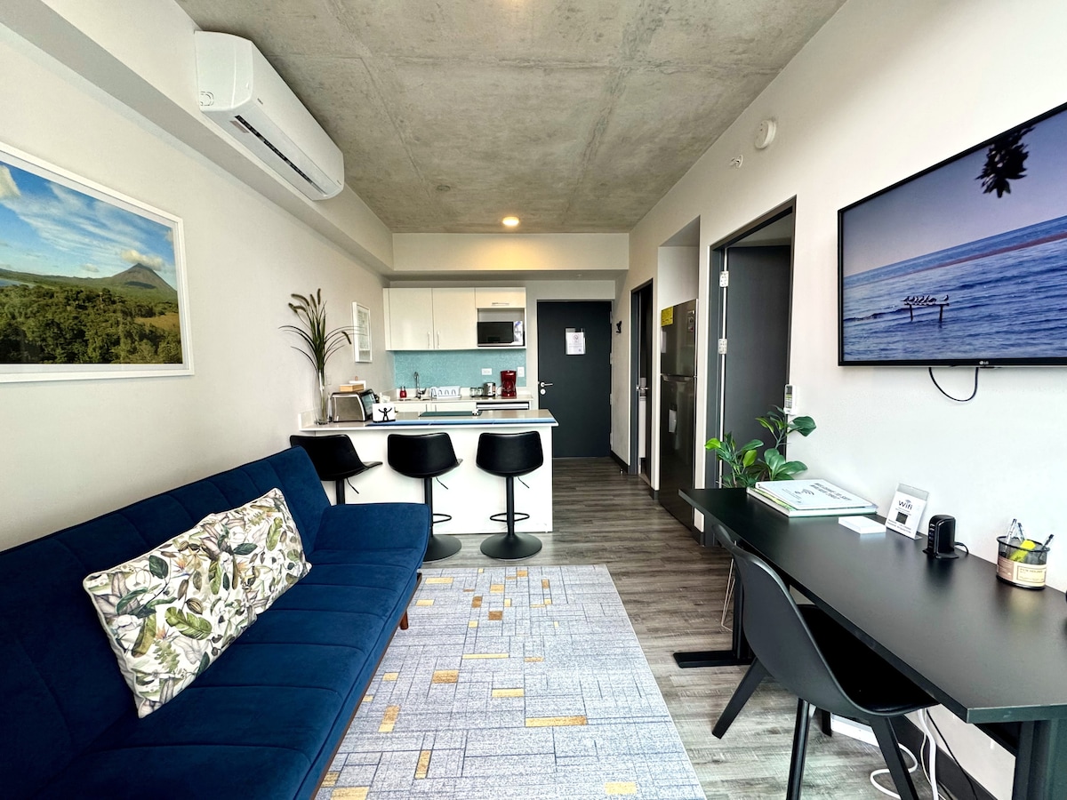 CR Stays Welcomes you to this fully-equipped studio just 4 miles from Juan Santamaría Airport. Enjoy breathtaking views of the Escazú mountains, a king bed, queen sofa bed, fast Wi-Fi, and air conditioning—ideal for 4 guests. The building boasts a gym, pool, BBQ terrace, private cinema, and meeting rooms. Minutes from Plaza Real Cariari’s shops and restaurants, and located in a prime business hub. 24/7 security for a safe, stylish, and comfortable stay.