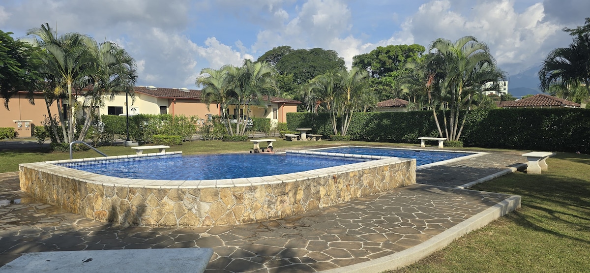 Relax with the whole family in this peaceful place to stay. 3 bedroom apartment in a housing complex with trails, lake, swimming pools, full of green areas, beautiful views. With an excellent location very close to the main highway of Costa Rica ("27"), just 10 minutes from Juan Santamaría Airport.