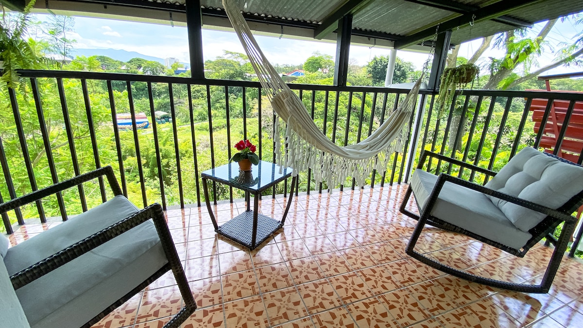 Experimenta un refugio fresco y lleno de luz en Alajuela. Disfruta de la vista con un café o una copa desde una gran terraza hacia las montañas. A solo 5 min del centro y 12 min del Aeropuerto (tiempo de viaje variable). Este espacio ofrece comodidad en la habitación, una amplia sala y cocina equipada. Además, cuenta con un baño cómodo, estacionamiento, y la posibilidad de servicio de lavandería por un costo adicional. ¡Tus mascotas son bienvenidas para que disfruten de la experiencia contigo.