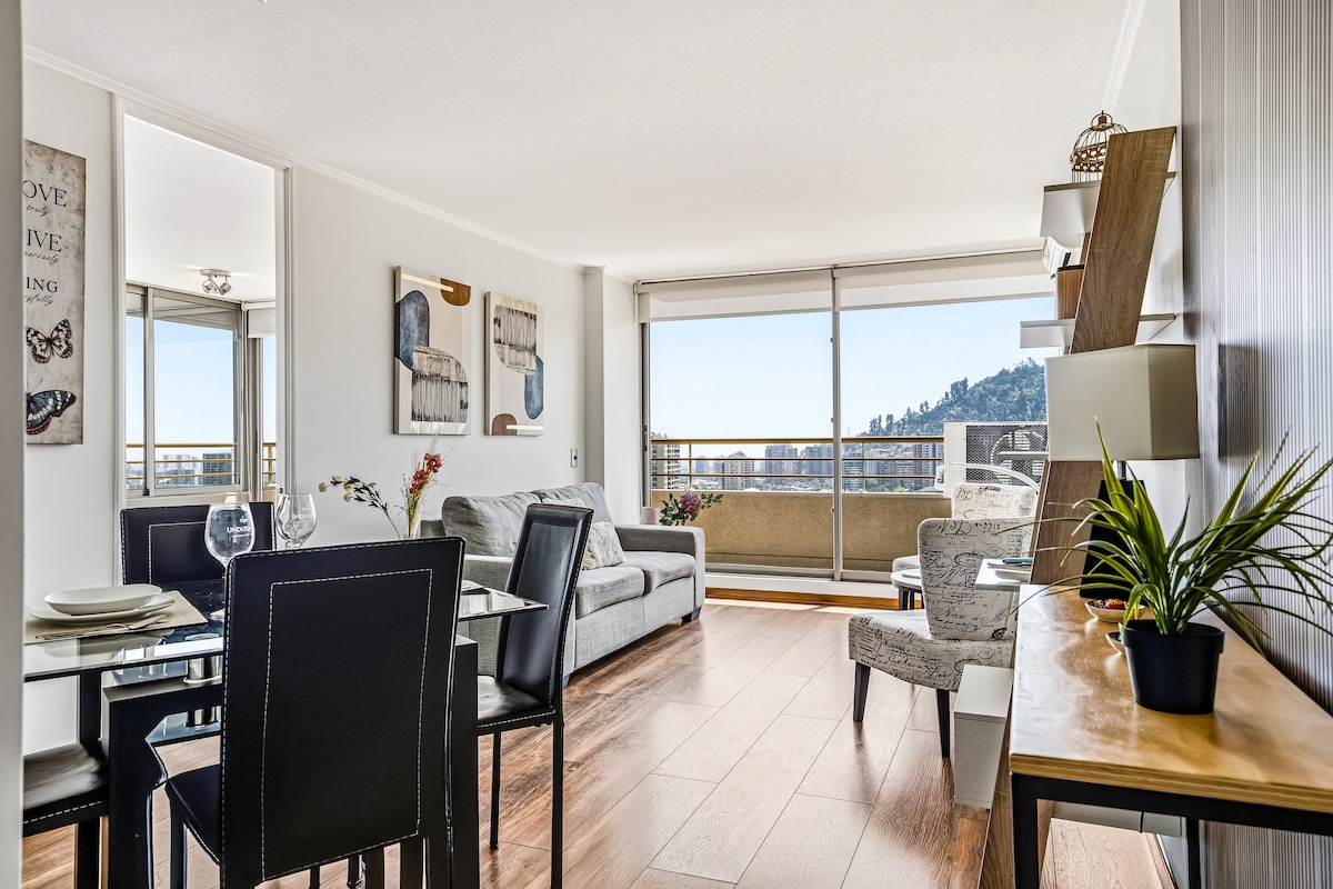 Moderno departamento con espectacular vista a la cordillera, a pasos del Mall Parque Arauco. Piscina temperada, gimnasio, seguridad 24h y estacionamiento. Dos habitaciones, cama king + 2 camas individuales, sofá cama de dos plazas en la sala, 2 baños, terraza cerrada con protección en ventanas, ideal para familias. Lavadora/secadora, lavavajillas, Wi-Fi alta velocidad y escritorio de trabajo. Totalmente equipado para estadías cómodas, seguras y funcionales.