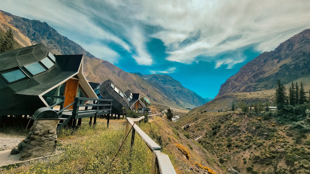 Acogedora cabaña de 2 pisos, que te permite tener una vista excepcional a las montañas. La cual se encuentra inmersa en un bosque nativo en el que debemos caminar por 150 mts desde el estacionamiento, durante el camino podemos apreciar diversa flora que solo veras en el cajón del Maipo. Es un lugar ideal para relajarse y descansar ya que incluye terraza (con mesa y sillas) , tinajas calientes a leña con hidromasajes y horno de barro.