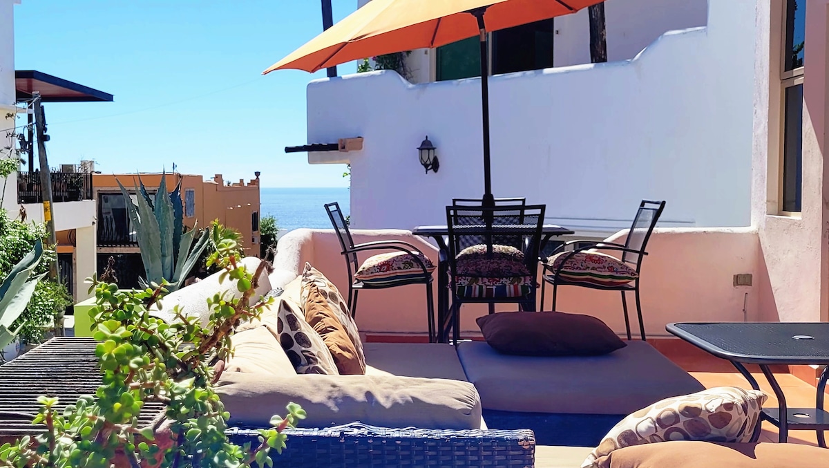 King size bed studio apartment recently built with a private bathroom and roof top deck equipped with a vegetable garden, grill, sink, lounge chairs & sofa to relax & enjoy the view of Medano Bay, the Pacific Ocean and beautiful sunsets. Located 2 miles north of downtown Cabo San Lucas. 20 min bus ride to Medano Beach. Visit us soon!