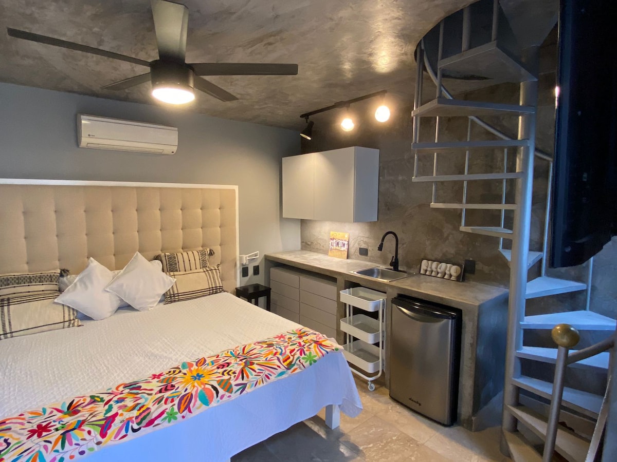 Estudio pequeñito y acogedor en (ultimo) piso con escaleras angostas, para 1 o 2 personas, locación excepcional en San José del Cabo, cruzando la calle esta la playa y caminando puedes llegar al super mercado, Restaurantes y el área de la alberca es un plus para relajarse. Cozy studio for 1 or 2 persons, on top floor (last floor) no elevator, perfectly located 3 minutes from Beach, walking distance to downtown, Restaurants and super market and the pool area is a very relaxing place.