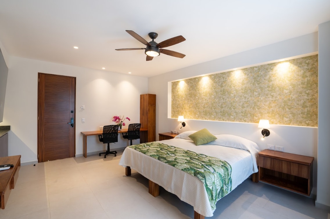 Relájate en este espacio tan tranquilo y elegante, suite con 1 cama king-size, living room, balcón, cocineta equipada con horno de microondas, cafetera, licuadora, refrigerador. Área de trabajo, Wifi gratis, Smart TV, Caja de seguridad y toda la comodidad que necesitas. Posibilidad de conectar con otra habitación para más espacio, ideal para viajes de negocios o placer. Excelente ubicación a tan solo 5min del aeropuerto, muy cerca del Centro de Convenciones y Central de Autobuses.