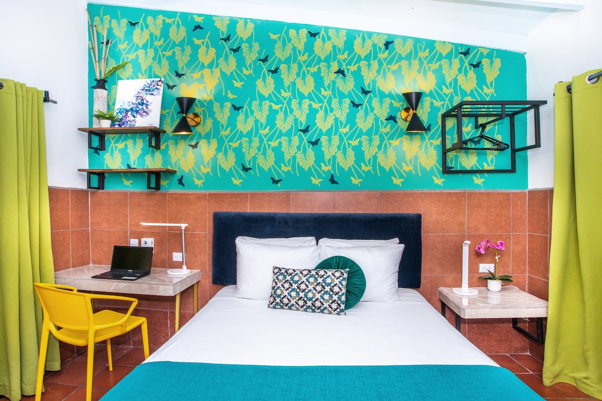 Our smallest studio at 17m2. It includes a comfortable Queen bed, kitchenette, private bath with hot shower, desk, Wi-Fi, A/C, and flat-screen TV w/cable. All in a compact, colorful, hand-painted studio with patio. It is perfect for independent, up-scale, budget-conscious travelers exploring Costa Rica. Located at the bus stop, on the main road in Manuel Antonio. Only 15 mins to the beach and National Park, or 10 minutes to Quepos. ADULT-ONLY PROPERTY / NO KIDS ALLOWED / NO PETS ALLOWED