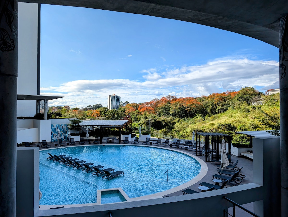 Luxury apartment with A/C, cozy, and perfectly located in the heart of the city. This fully equipped space, with modern and elegant decoration, offers you the freedom to live safely and comfortably while exploring everything the city has to offer. Close to tourist attractions, banks, supermarkets, and restaurants. (The condominium has 8 restaurants within the facilities) The International Airport (SJO) is 20 minutes away, La Sabana Park and the new National Stadium are 3 min away in San Jose.