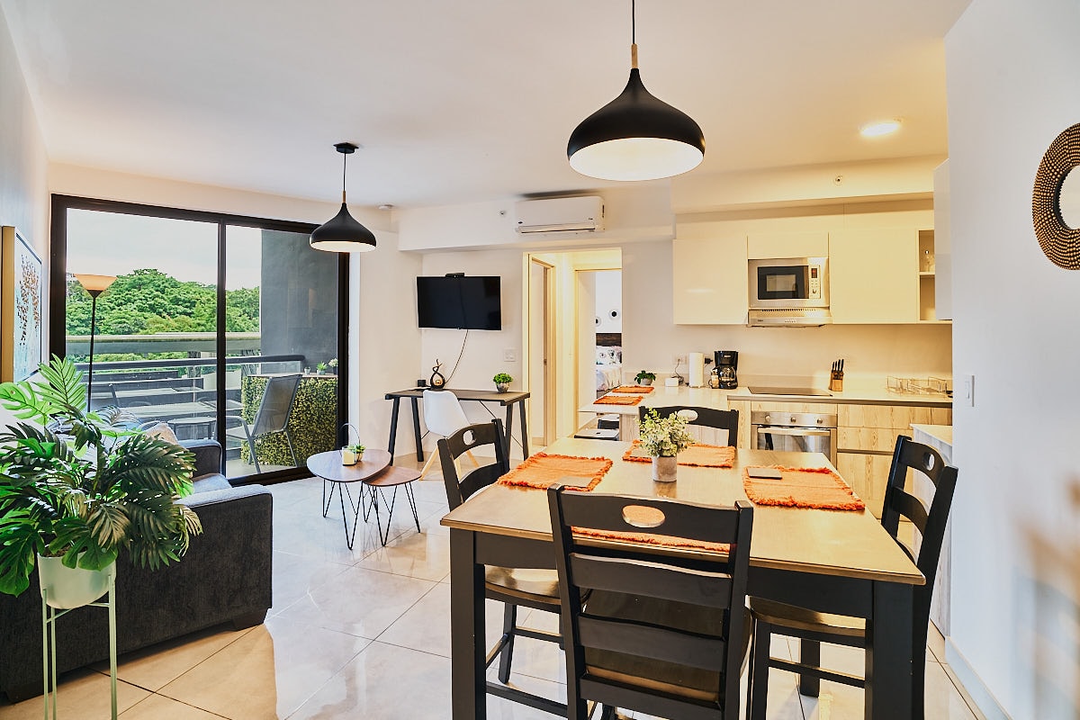 Luxury apartment with A/C, cozy, and perfectly located in the heart of the city. This fully equipped space, with modern and elegant decoration, offers you the freedom to live safely and comfortably while exploring everything the city has to offer. Close to tourist attractions, banks, supermarkets, and restaurants. (The condominium has 8 restaurants within the facilities) The International Airport (SJO) is 20 minutes away, La Sabana Park and the new National Stadium are 3 min away in San Jose.