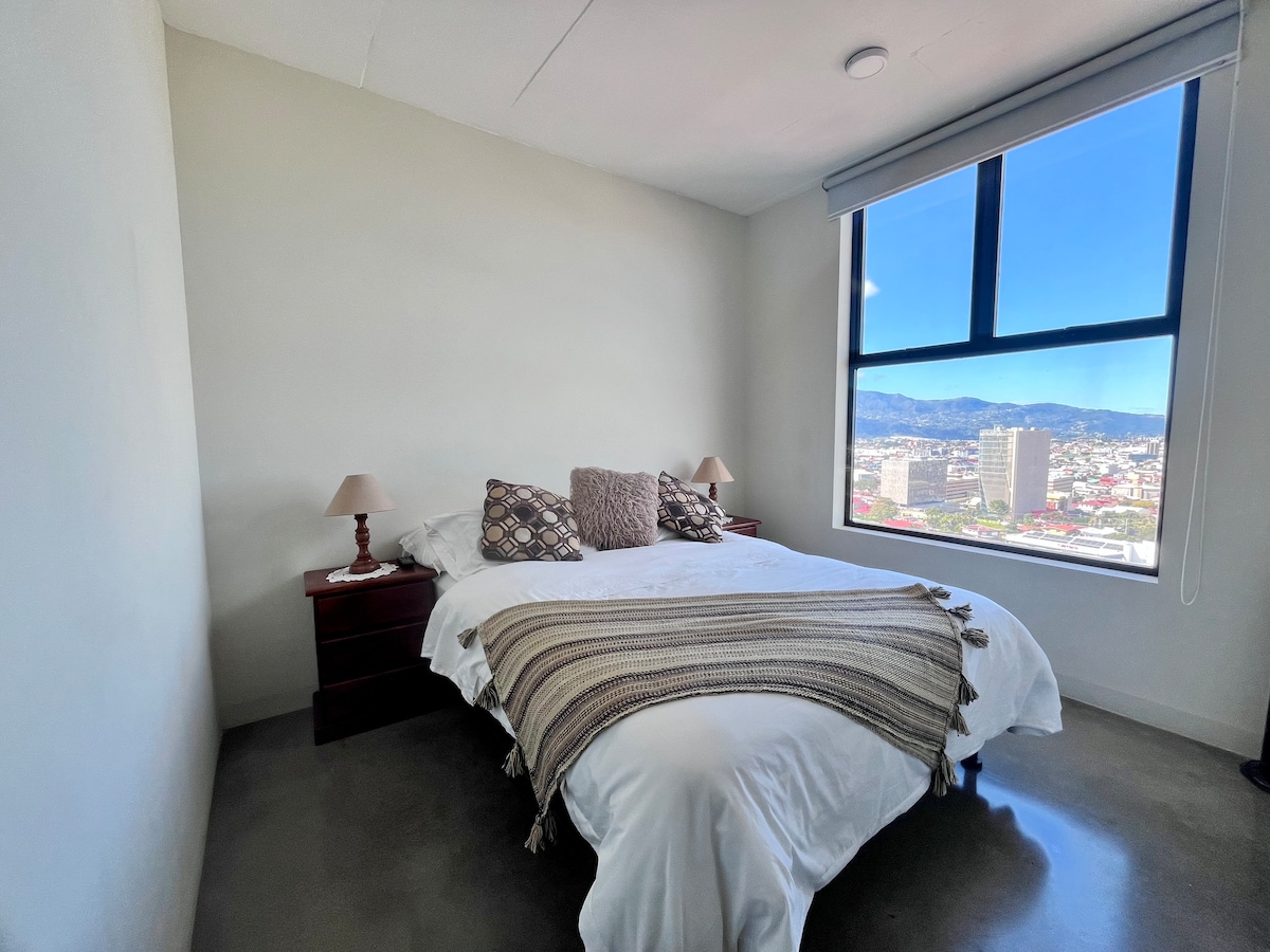 Luxury apartment with A/C, cozy, and perfectly located in the heart of the city. This fully equipped space, with modern and elegant decoration, offers you the freedom to live safely and comfortably while exploring everything the city has to offer. Close to tourist attractions, banks, supermarkets, and restaurants. (The condominium has 8 restaurants within the facilities) The International Airport (SJO) is 20 minutes away, La Sabana Park and the new National Stadium are 3 min away in San Jose.