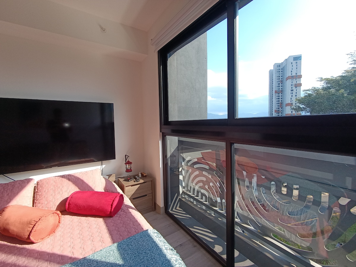 Te ofrecemos un aparta en un piso 18, con vista panorámica y brisa fresca. Este loft moderno combina estilo y comodidad con un balcón integrado, cortinas blackout para mayor confort, wifi y parqueo privado. En el piso 25 contamos con una piscina infinita, área de iworking y más. Estamos ubicados en una zona segura y céntrica de Curridabat, donde tendrás todo a tu alcance. Como Súper Anfitrión Top 10% en Costa Rica, garantizo atención rápida y dedicada para que tu estadía sea inolvidable.