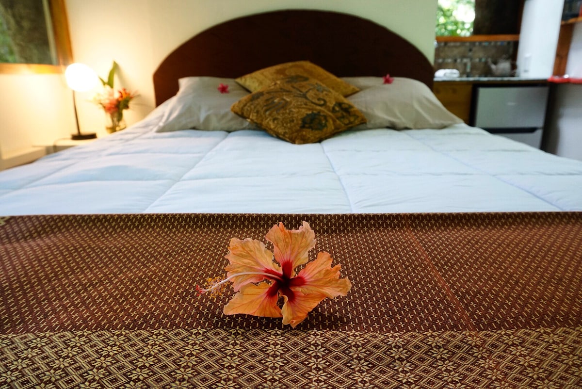 In nature, with the birds. The Tree House is a quiet, private getaway. Basic but with the creature comforts of a comfortable bed, hot shower, cold drinks and hot coffee. It's a slice of the real Pura Vida in Costa Rica. Extra deck space for your own yoga platform. Please know that the kitchen is basic at the Tree House, though there is a mini refrigerator, hot plate, coffee maker, sink and counter top for preparing simple foods.