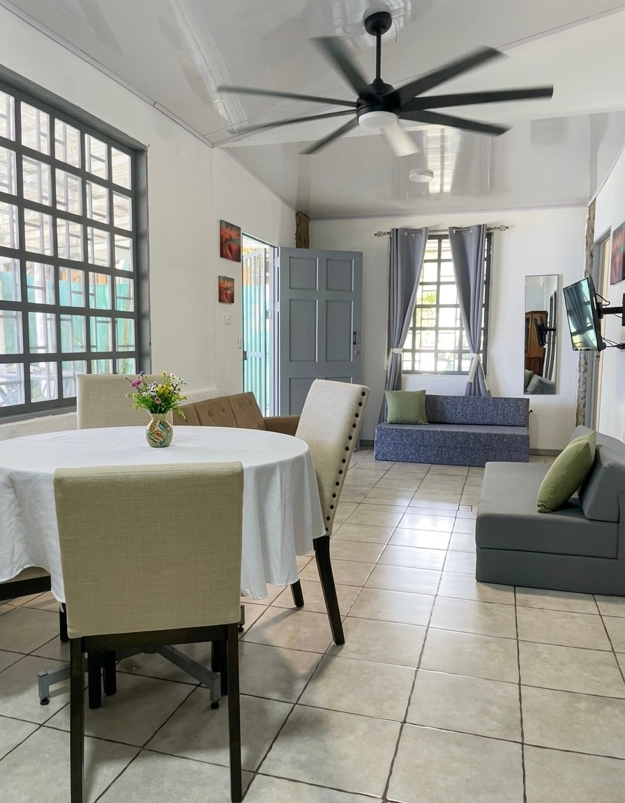 Casa Blue Rock Departamento en un primer piso hecho con amor con la mayor atencion para los detalles , con un gusto moderno y un estilo minimalista limpio lleno de luz. Una amplia sala con tres colchones cama, TV con cable internet 10 mega con WI FI ,con cocina una mesa de 5 lugares, baño privado con panel de ducha con hidrojets de masaje. Una recamara privada donde sale de el piso la famosa roca azul, con una cama King . Aire acondicionado y dos ventanales enormes con vista al bosque lluvioso