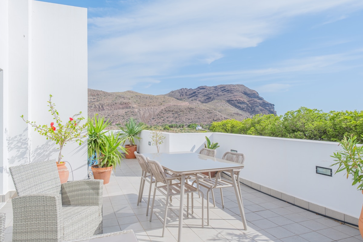 A un minuto andando de la playa principal de San José. Gran terraza individual en la azotea, con vistas panorámicas, se oyen las olas y los pájaros. Cocina y baño nuevos, camas y muebles nuevos, menaje completo. Al lado del Paseo Marítimo, restaurantes y supermercado. Acceso individual con 6 escalones. Muy cerca de Mónsul y Genoveses, las mejores playas vírgenes del Parque Natural Cabo de Gata-Níjar. No se aceptan mascotas. No fiestas.