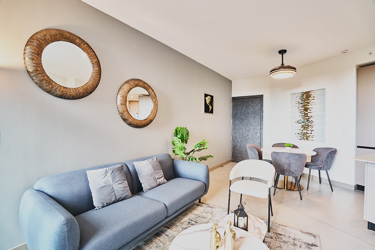 CR Stays Welcomes you to this fully-equipped studio just 4 miles from Juan Santamaría Airport. Enjoy breathtaking views of the Escazú mountains, a king bed, queen sofa bed, fast Wi-Fi, and air conditioning—ideal for 4 guests. The building boasts a gym, pool, BBQ terrace, private cinema, and meeting rooms. Minutes from Plaza Real Cariari’s shops and restaurants, and located in a prime business hub. 24/7 security for a safe, stylish, and comfortable stay.