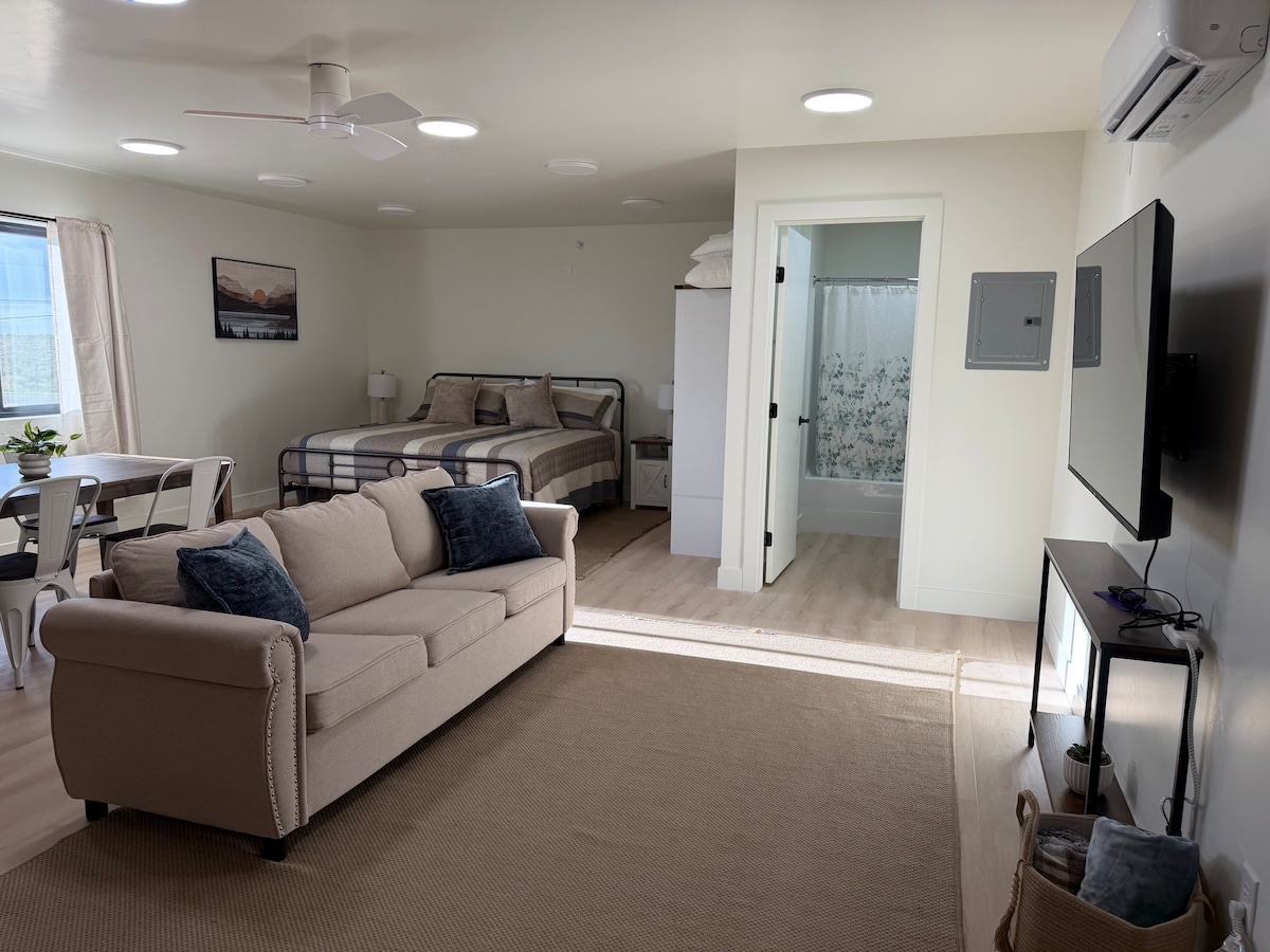 This stylish studio apartment is perfect for extended stay guests who want to spend time exploring the Four Corners and Bears Ears National Monument. Dedicated workspace with high speed fiber optic internet in a beautiful area with numerous hiking and site seeing opportunities. The apartment is 1200 square feet with bedroom and work area on one end and the kitchen and living room on the other. Breville Grind and Brew and fresh coffee.