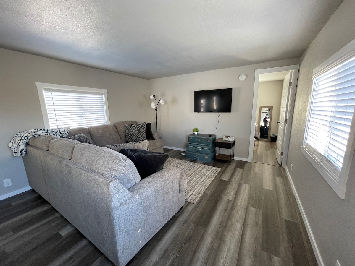 This 1940's Bungalow is modern with a hint of it's original charm. This home features a fully equipped kitchen waiting for you to share all of your favorites after a long day of adventuring! Creatively designed to maximize space while keeping an open feeling. The private bedroom features a Queen sized bed or you can snuggle up on one of our two twin beds cleverly arranged to create a comfy sofa for any down time. Clean up after a long day with our fully stocked bathroom and laundry room!