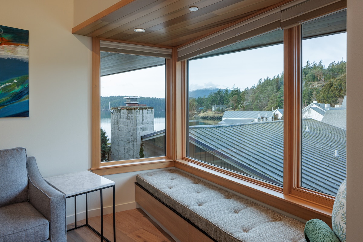 Luxury King Room plus double sofa bed with partial water view of Eastsound Bay and surrounding Village of Eastsound on Orcas Island, WA
