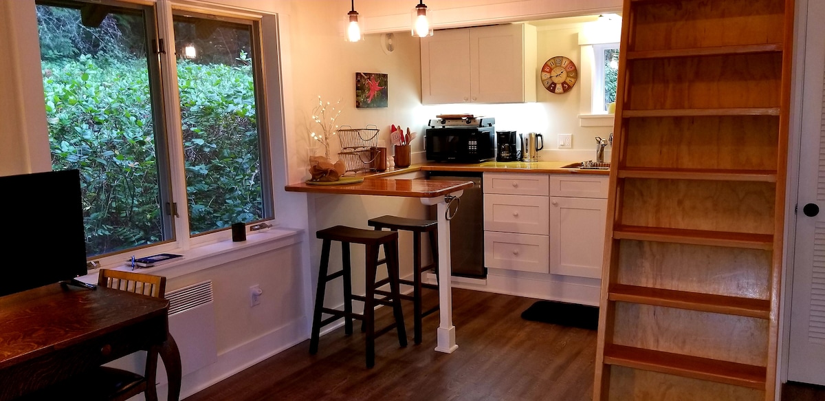 Primrose: a small studio cabin, Rustic. romantic, private. Cedar with hardwood floors, Queen bed, fireplace, TV monitor with Netflix, and for streaming your services, love seat, French doors. Covered porch faces the water. a table for your morning coffee. path to the hot tub, (shared separately with another cabin. not together) The bedroom/ living space is one cozy room. Compact kitchen: table, dishes, cookware, 2 burner stove, Air Fryer, microwave, drip Coffee maker. fridge,. charcoal BBQ.