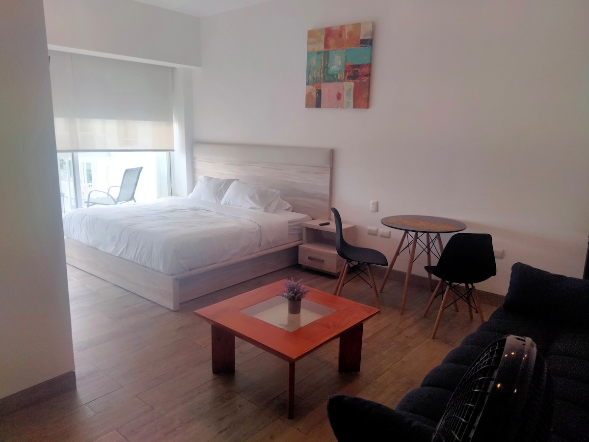 Luxury loft with terrace in Sonata Towers, Lomas de Angelópolis. Features a bedroom with a double bed, plush closet, TV, and a full bathroom with premium fixtures. The living area includes a sofa, dining area with microwave, frigobar, coffee station, and desk. Enjoy covered parking, valet service, and room service from the in-building restaurant. Steps from the vibrant Sonata District—shops, dining, and cultural activities. Ideal for business or leisure, with 24-hour security for a safe stay.