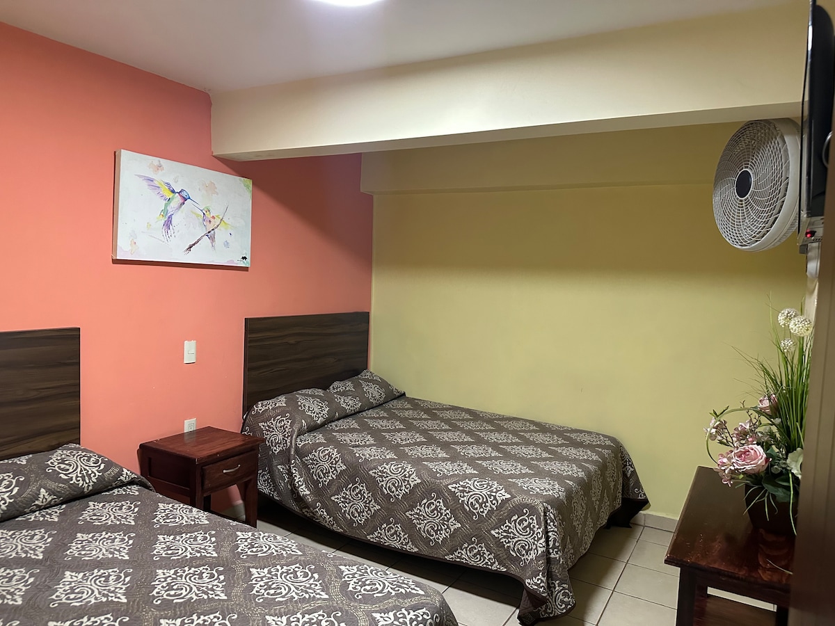 Descubre nuestro hotel en San Juan de los Lagos, idealmente ubicado cerca de la catedral. Nuestra amplia habitación tiene dos camas matrimoniales, perfecta para familias o grupos, y un baño completo con todas las comodidades necesarias. Disfruta de dos balcones con vistas a la calle, excelente iluminación natural, wifi de alta velocidad en toda la propiedad, y una pantalla de 32 pulgadas con señal por cable. Reserva ahora y disfruta de una estancia inigualable en una ubicación privilegiada.