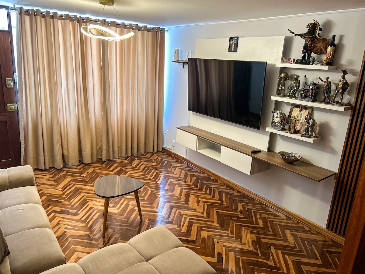 Descubre este acogedor departamento recién amoblado y equipado con todo lo que necesitas para una estancia cómoda y memorable. Tiene un potente internet, perfecto para una excelente y rapida conexión. Ubicado en el barrio de Surco, a 25 minutos de Barranco y Larcomar. El departamento ofrece comodidad y está acondicionado para 2 personas. La habitación cuenta con cama de 2 plazas y tiene a disposición una Smart TV de 43".
