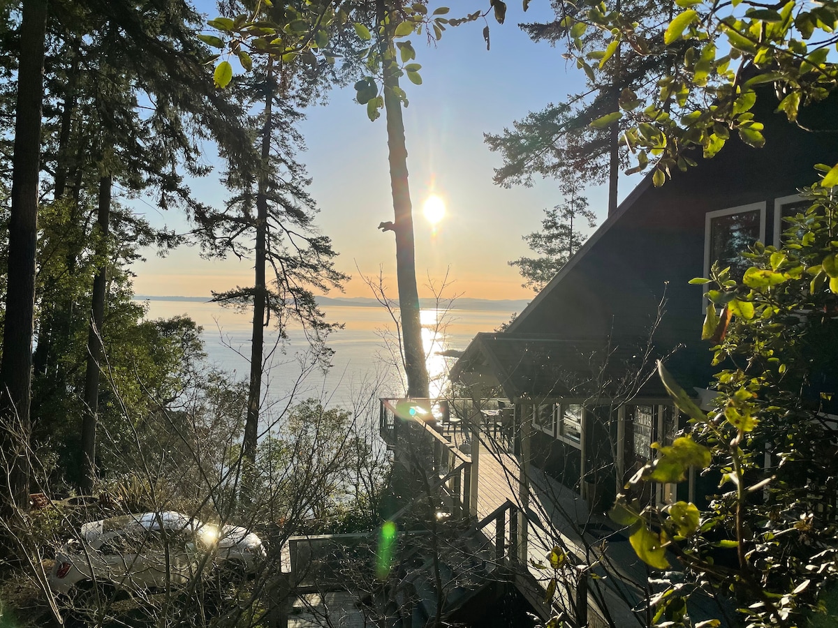Haro Haiku - West side of beautiful San Juan Island The house is nestled just below the ridge line with 180 degree views, framed by the Olympic mountains, the Salish Sea, the Straits of Juan de Fuca beyond, and Haro Straits immediately below. Sunrises, sunsets, ship and boat traffic, the lights of Victoria, the Olympic Peninsula, clear starry nights, cloud formations, combined with the sound of whales and surf below. It never fails to inspire and delight.………truly awesome!! SJC Permit #05CU11.