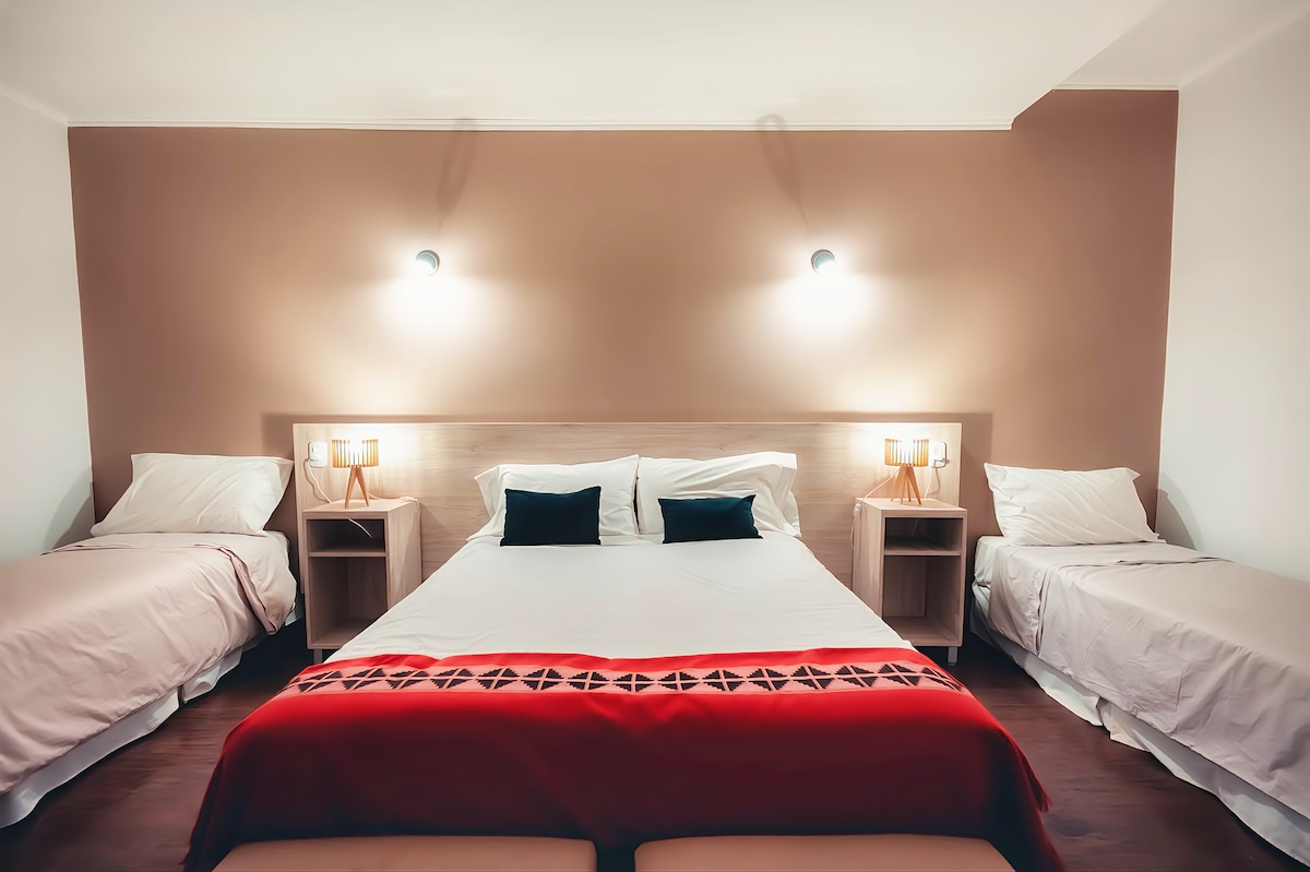 Equipada con somier 2 King size, piso parket y exclusivos detalles. Su cuarto de baño posee terminaciones en mármol y porcelanato de la más fina calidad, hidromasajes, SMART TV 40 pulgadas, frigobar, aire acondicionado split frio calor con control individual y caja de seguridad para notebooks hasta 17 pulgadas.