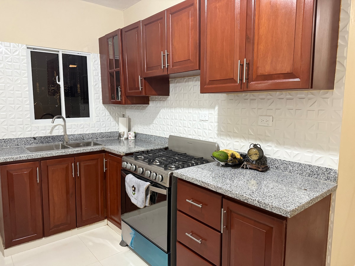 Central apartment with a view of the Cordillera. With WI-FI, Smart TV, Air Conditioning, Water Heater, Fully equipped kitchen with stove, refrigerator, blender, electric coffee maker, Air Fryer and all the necessary utensils. Comfortable, spacious and cool! Ideal for Groups - Family - Work - Rest - Ecological Adventures (routes to Pico Duarte, hiking, etc.). 100 meters from the Sports Stadium and 50 meters. supermarket, store, hardware store, pharmacy...