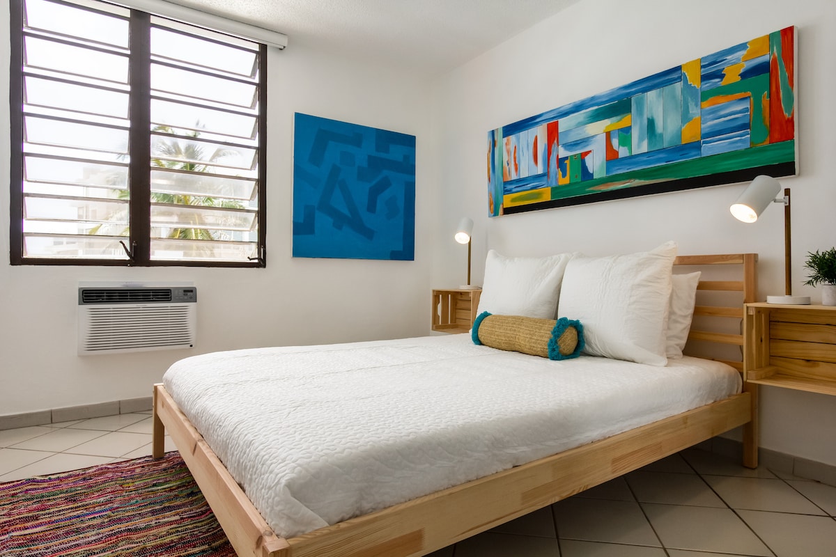 If you’re planning on staying on the most beautiful beach in the greater San Juan area, you’ve found the right place! Located on one of PR’s best strips, you’ll have turquoise waters on one side & a 2mile strip to explore on the other. Just take the elevator down! No hidden fees. 5 min from airport, 10 min or less to Old SJ, cruise ports, downtown SJ, Santurce, Condado, etc and 45 min drive to El Yunque. Free parking, air conditioning, hot water, beach equipment, SmartTV, Wi-FI, solar chargers.