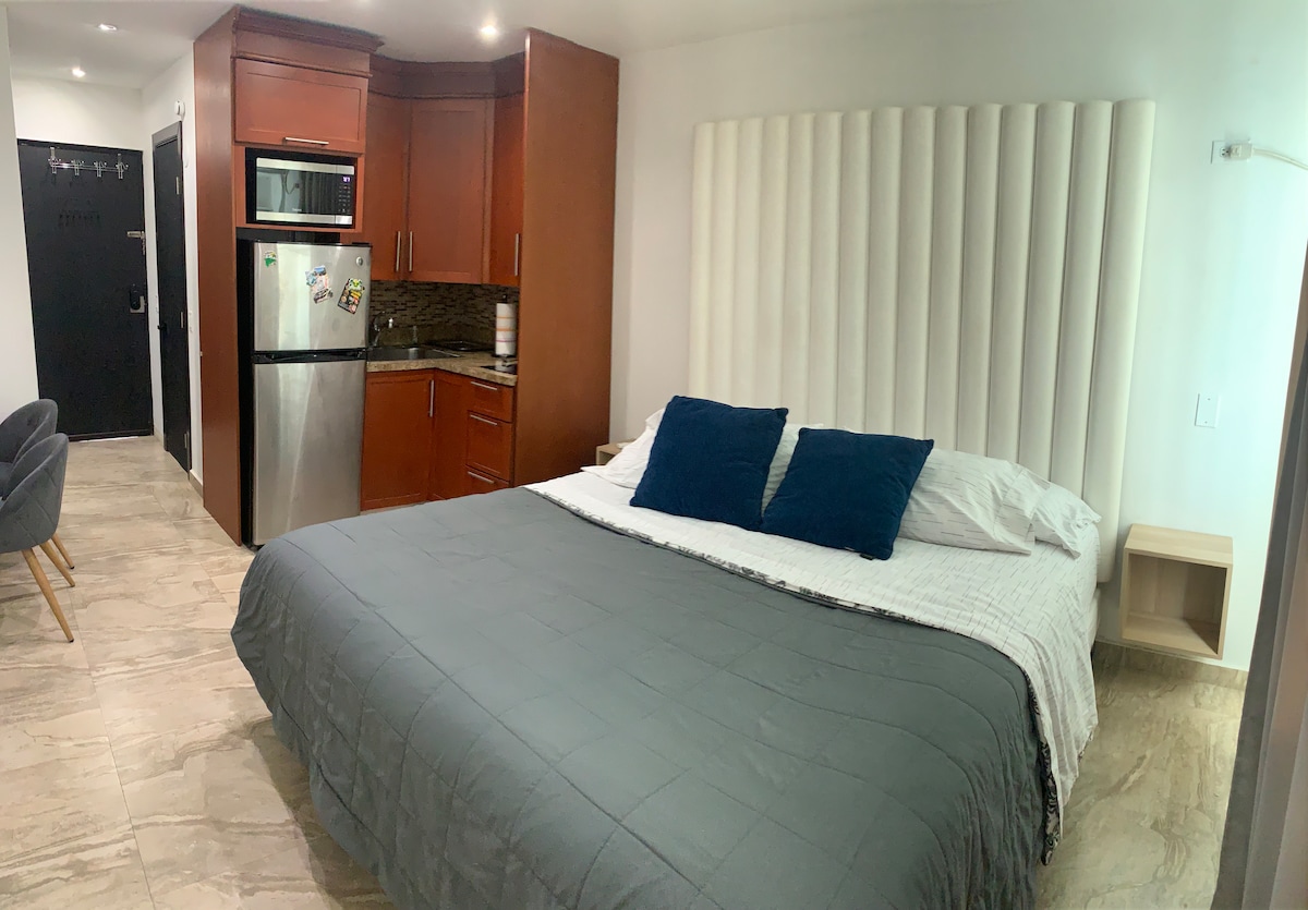 Modern and recently remodeled 580m2 aprox Studio apartment for Romantic get away with the ideal location in the heart of Condado that will please your mind with its breathtaking ocean and lagoon views. ELECTRIC BACKUP AVAILABLE, TESLA BATTERY. 10 min. from Luis Munoz Marin Airport, 5 minutes from Isla Grande Airport, T-Movil District. Minutes from our iconic streets of Old San Juan, Morro San Felipe and highly prestigious restaurants in the capital. Greats activities walking distance.