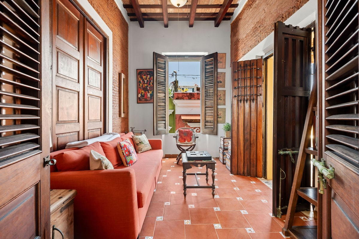 Location The apartment is located in Puerto Rico's political and cultural capital, San Juan. It's within walking distance of the best locations Old San Juan has to offer. Great bars and restaurants, hotels, casinos, San Critobal Castle, Paseo La Princesa , plazas and the cruise terminal are only steps away. In its sorroundings there are also farmacies, transportation services, a post office, stores for shopping,beaches and Cathedrals. The apartment is a 10 minutes drive to the Convention Center and 20 minutes to the international airport,. Spaces Typical of Spanish Colonial architecture the apartment spaces include an indoor balcony, perfect for relaxing, and tall ceilings, up to 20 feet high, sporting traditional Ausubo wood beams. Amenities Full kitchen with an industrial stove and oven, microwave, refrigerator, coffee maker and dinnerware. The cozy bedroom has a comfortable queen bed, a/c and drawers for storage. Living room with Flat HDTV, Blue Ray, DVD player, WI-Fi, Satellite dish. Laundry access in the hall.