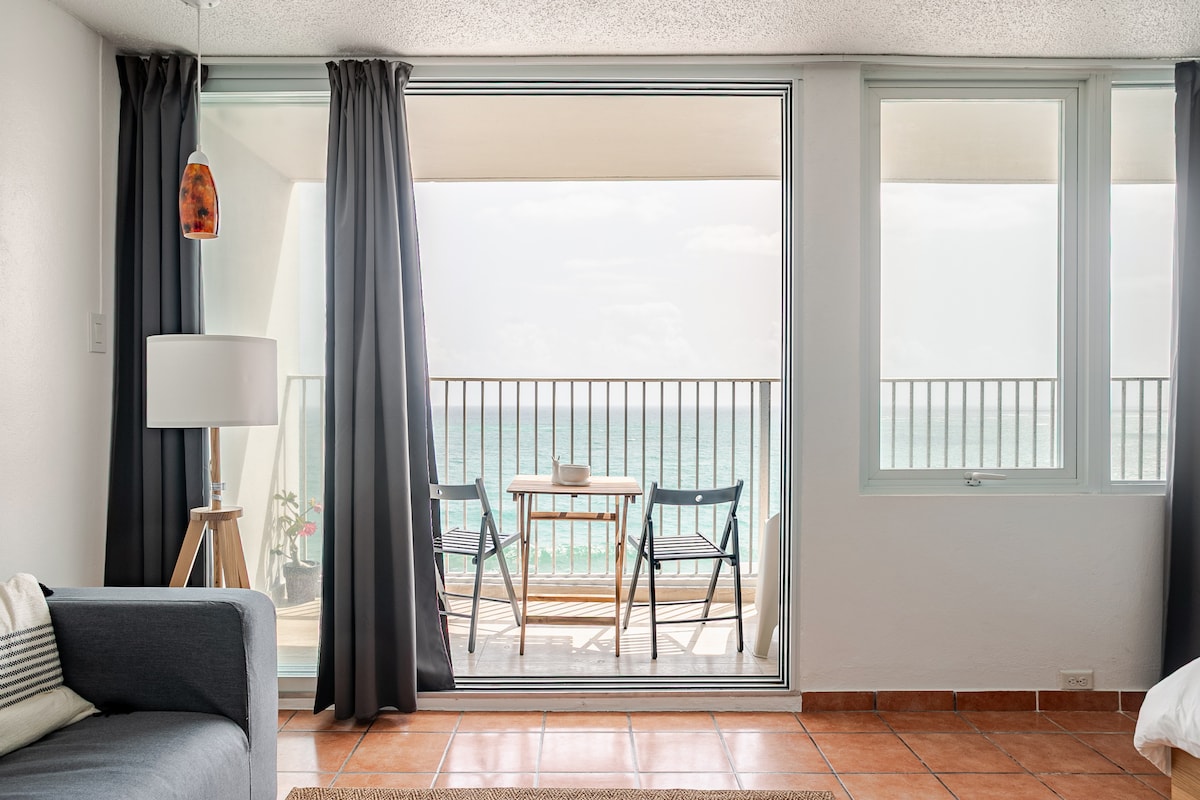 Enjoy million-dollar ocean views from this 15th-floor studio, just 5 minutes from SJU Airport ✈️ and steps from the beach 🏝️. Fully equipped for your stay with a king bed, pull-out sofa, and kitchen 👩🍳. Self check-in anytime after 3 PM, one free parking 🅿️ spot, and access to paid laundry 🧺 machines. Free luggage storage 🧳 before check-in/after check-out. A 24/7 supermarket is 5 minutes away. **NOTE: Pool is closed** Book your Puerto Rico 🇵🇷 escape today! ☺️