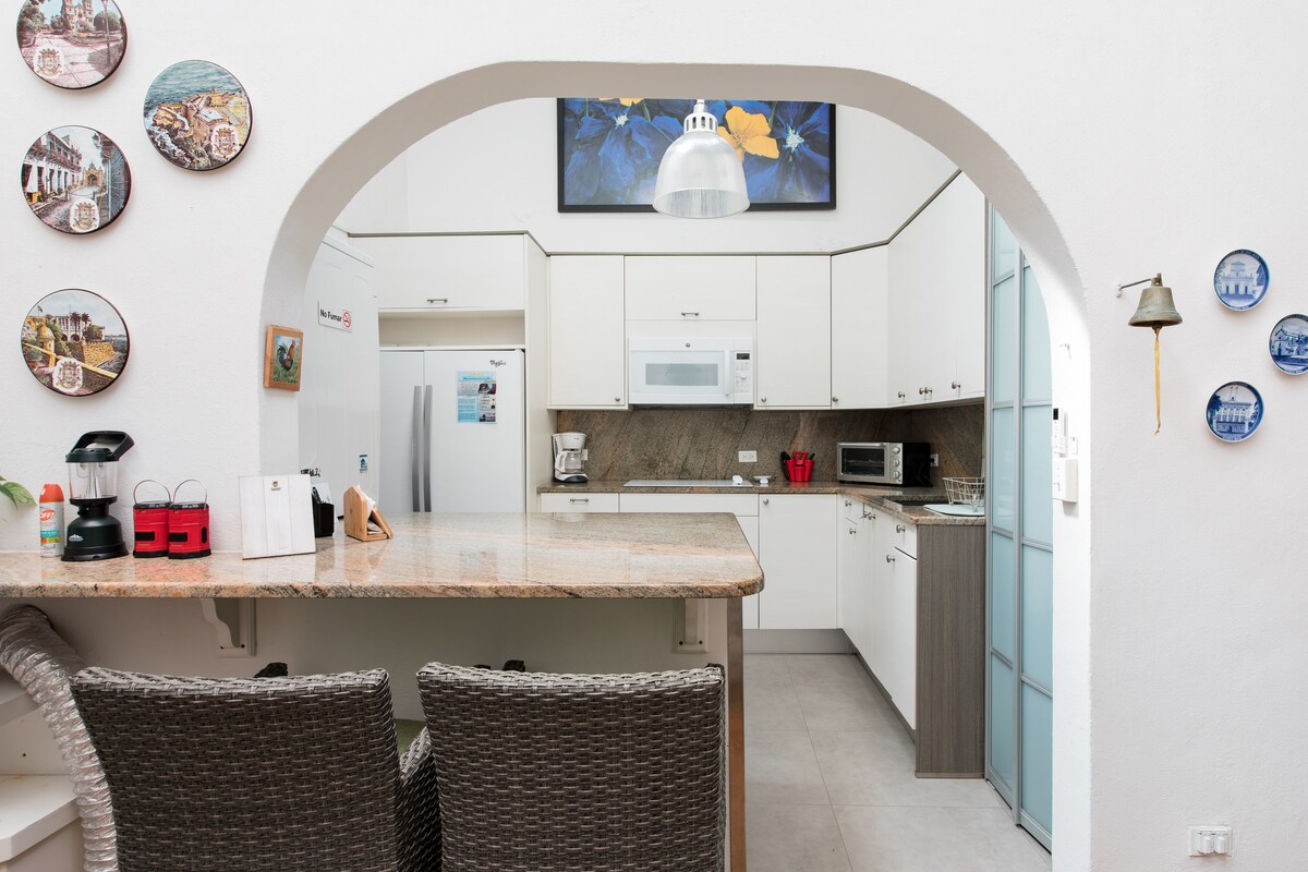 Enter through sturdy double doors and stride across terra cotta tiles to admire an atrium filled with plants. Pass under an archway to prepare meals in a historic colonial home. Sleep in air-conditioned bedrooms after exploring nearby cultural sites. Puerto Rico has been spared the worst effects of the Covid-19 pandemic by our prompt action in implementing safety measures. For your safety, we follow all CDC, PR Tourism and Airbnb regulations in cleaning and disinfecting. Please see discoverpuertorico.com for details on government regulations you must comply with prior and during your stay. The house is fully renovated, with high ceilings, arches and a classical Spanish interior patio. There are many decorating touches and liberal use of plants create a tropical environment that invites relaxation. You will have full access to the house. We will provide you with a detailed description and instruction of all the facilities in the house, including the operation of all the appliances such as washer / dryer, dishwasher and microwave instructions, Also included will be instructions for all remotes: satellite boxes, smart Hi Def TVs, and air conditioning. We will be available by cellphone, text messaging and Airbnb messaging to answer all your questions about the house facilities, and provide you with tourist information such as restaurants that we recommend, places to visit, shopping, tours to take, walking tours to do on your own, music venues, etc. We provide a detailed guidebook with photos. In addition, we can arrange for knowledgeable, certified guides to take you on tours of Old San Juan and other areas around the island, including beaches in the San Juan area, and many eco oriented tours. The house is in Old San Juan. It is easy access important sights such as La Puerta de San Juan, El Morro Spanish Fort, La Rogativa, La Princesa, Ballaja, Las Americas Museum, City Museum, La Fortaleza, Plaza de Armas, and Cristo Street. Old San Juan is built for walking. You will not need a car while you are in Old San Juan. If you need to get out of Old San Juan, you can get a taxi in a taxi stand near the house, or use Uber. If you have a big group we can possibly arrange for group transportation. If you rent a car, Old San Juan has a variety of public parking lots and a trolley system to help you move around the area during the day. Ask for more details. If after your visit you are continuing travel on a cruise ship to visit other Caribbean islands, you may be able to walk to your ship, as many ships start their trip from the port in Old San Juan. Or disembark from your ship and stay with us for a few days to enjoy this wonderful city.
