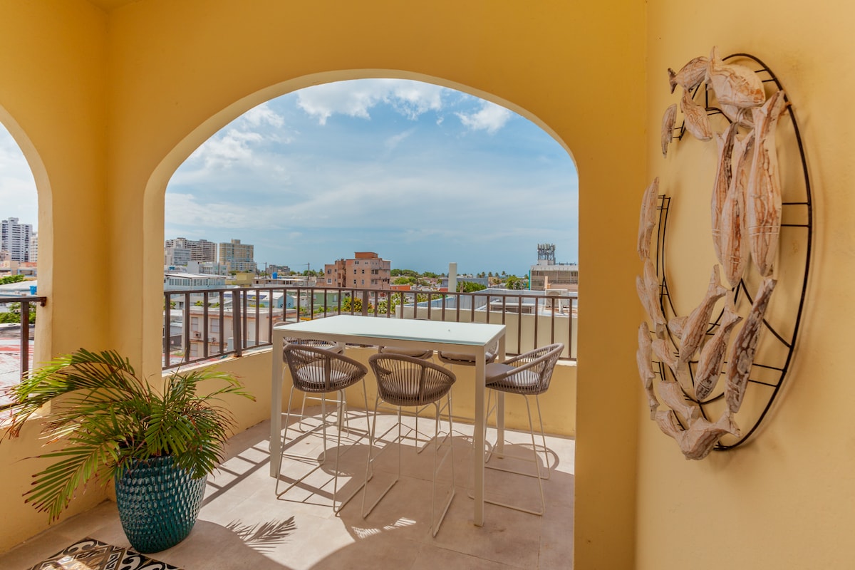 Get ready to enjoy the best of San Juan in this beautiful penthouse located on the fourth floor of a charming colonial building in Santurce. Just an 8-minute walk to Ocean Park Beach and steps from Loíza Street, a vibrant area full of restaurants, bars, and local culture. The highlight of the property is its wraparound terrace, perfect for morning coffee or sunset barbecues. Free private parking is available one block away and must be requested at booking, subject to availability.