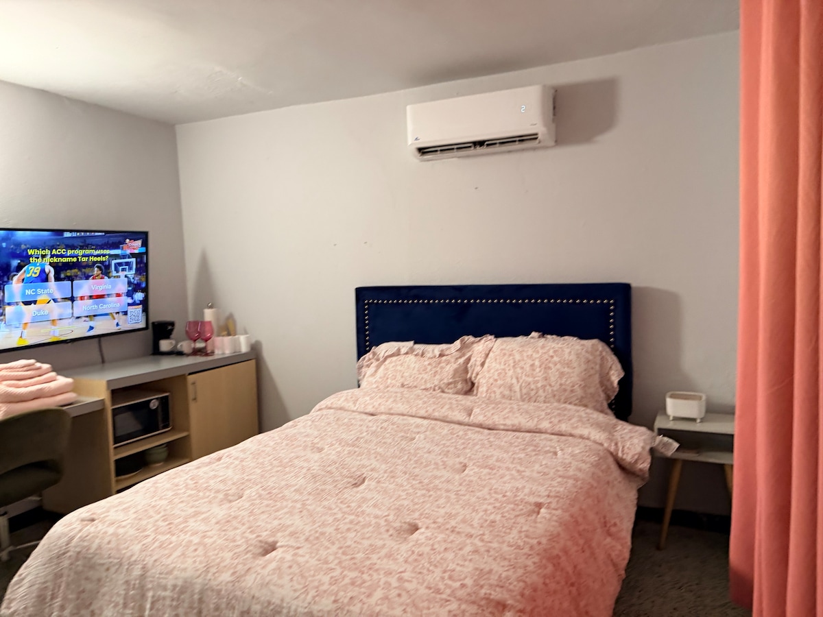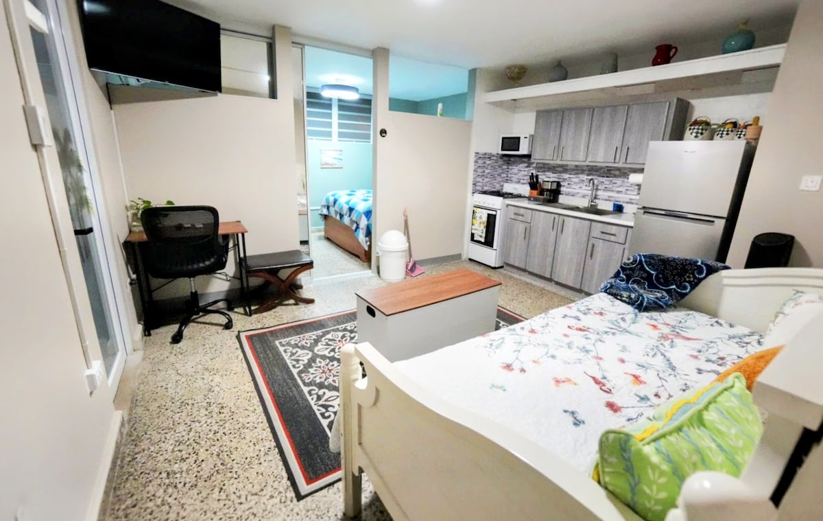 Encantador apartamento estudio con cama queen, nevera, microondas y baño, ubicado en el centro de la cuidad. Con rápido acceso a centros comerciales, turisticos, y lugares importantes del area metropolitana. A 6 minutos del aeropuerto tomando el puente Teodoro Moscoso. !Excelente lugar para hospedarse y descansar!