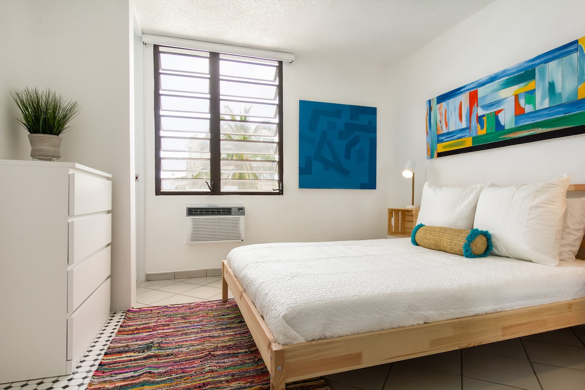 If you’re planning on staying on the most beautiful beach in the greater San Juan area, you’ve found the right place! Located on one of PR’s best strips, you’ll have turquoise waters on one side & a 2mile strip to explore on the other. Just take the elevator down! No hidden fees. 5 min from airport, 10 min or less to Old SJ, cruise ports, downtown SJ, Santurce, Condado, etc and 45 min drive to El Yunque. Free parking, air conditioning, hot water, beach equipment, SmartTV, Wi-FI, solar chargers.