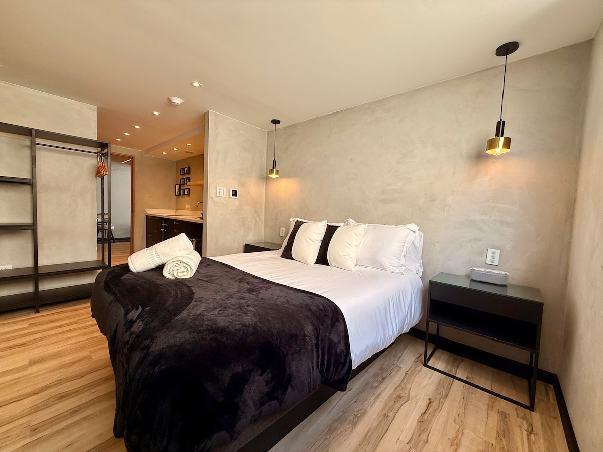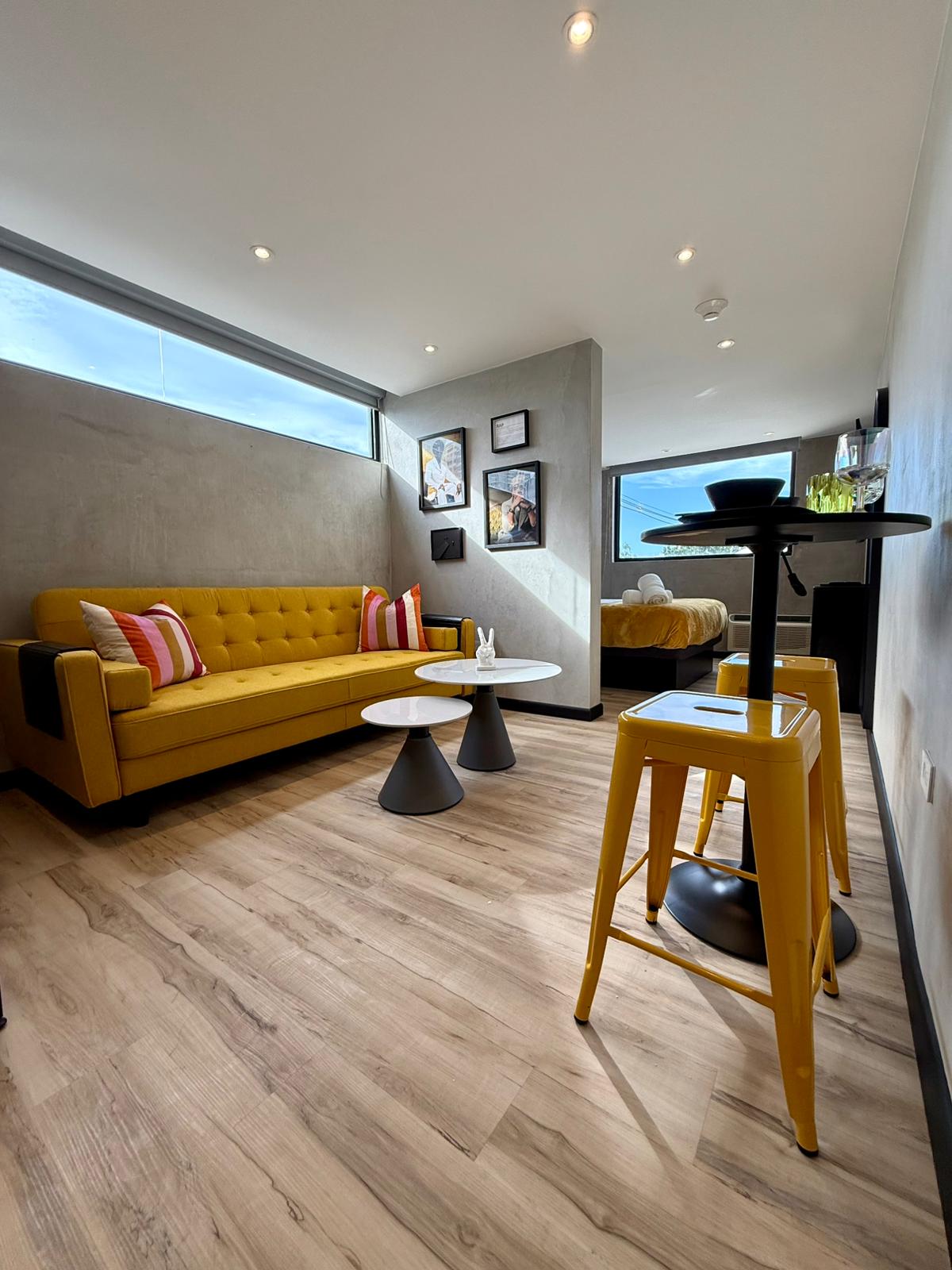 Casa Musa Suite 9 - Rap Music This stylish suite is centrally located in La Placita-where everyone wants to be. Casa Musa is a theme Boutique Hotel honoring our diverse musical culture. This suite's theme is inspired by the bold flow and streetwise energy of Puerto Rican rap, this master deluxe suite offers a queen bed, full kitchen, living room, and private bathroom. Elegant details and warm lighting, create a chic space to relax and feel uplifted.