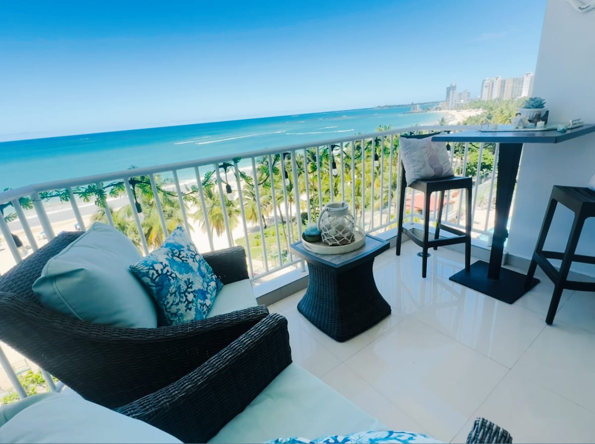 Ocean Front with Balcony. All cement tile floors, updated kitchen & bathroom, equipped for a beautiful beach vacation or short or long term stay. WiFi & 2 big flat screen TV's. Gorgeous view of the blue ocean & sky. Private balcony. On the beach with pool, sports courts, patios, barbeque & picnic area. 5 minutes from the San Juan ( SJU) airport. Share same smooth white sand beach with the famous El Juan hotel and Caino & Water Club & other 5 star hotels.