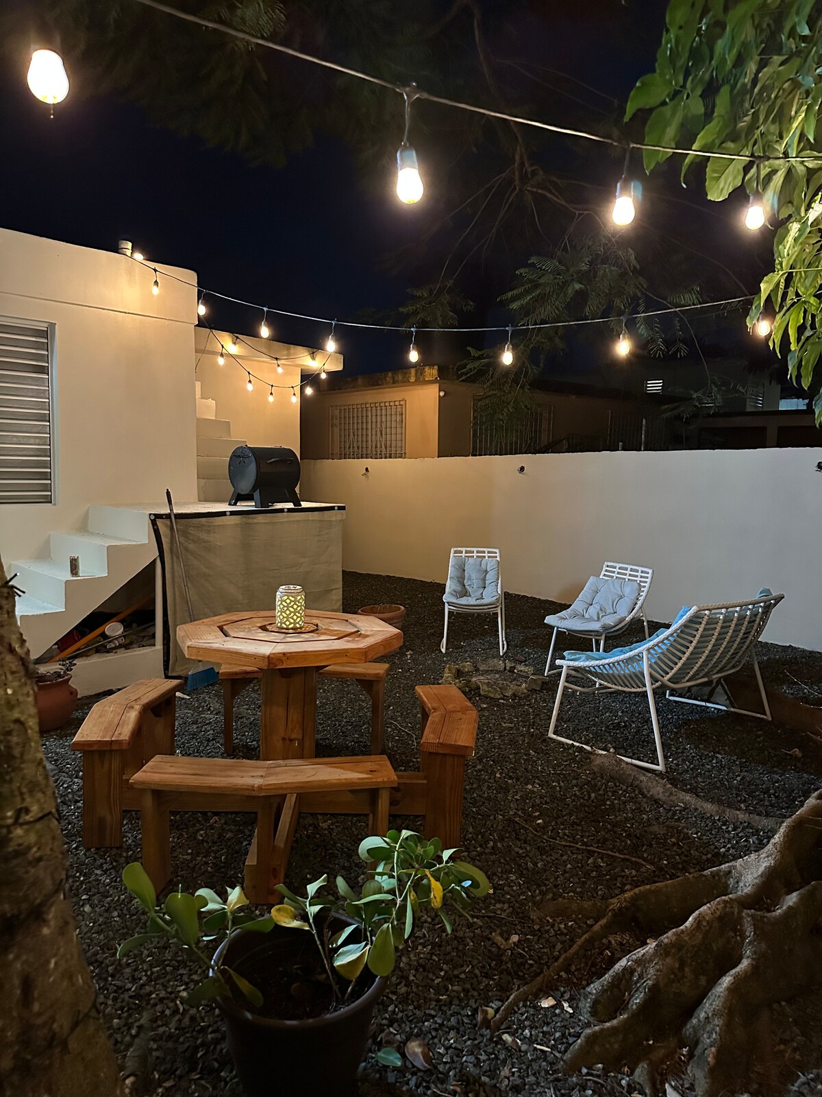 It's located in a 2 story property, I live in the 2nd floor and I rent the first floor as 3 vacational units: the Studio, a 1b/1b House & another Studio (or as a 2b/2b house, since this one can be rented as 2 separate units). Queen bed, bath room, kitchen & terrace. 3 minutes away from beach. Between Isla Verde & Condado & between the trendy Loiza st & McLeary st. in Ocean Park, also knowned as the Condado extended área Grocery stores, restaurants, bars and all kinds of stores nearby be.